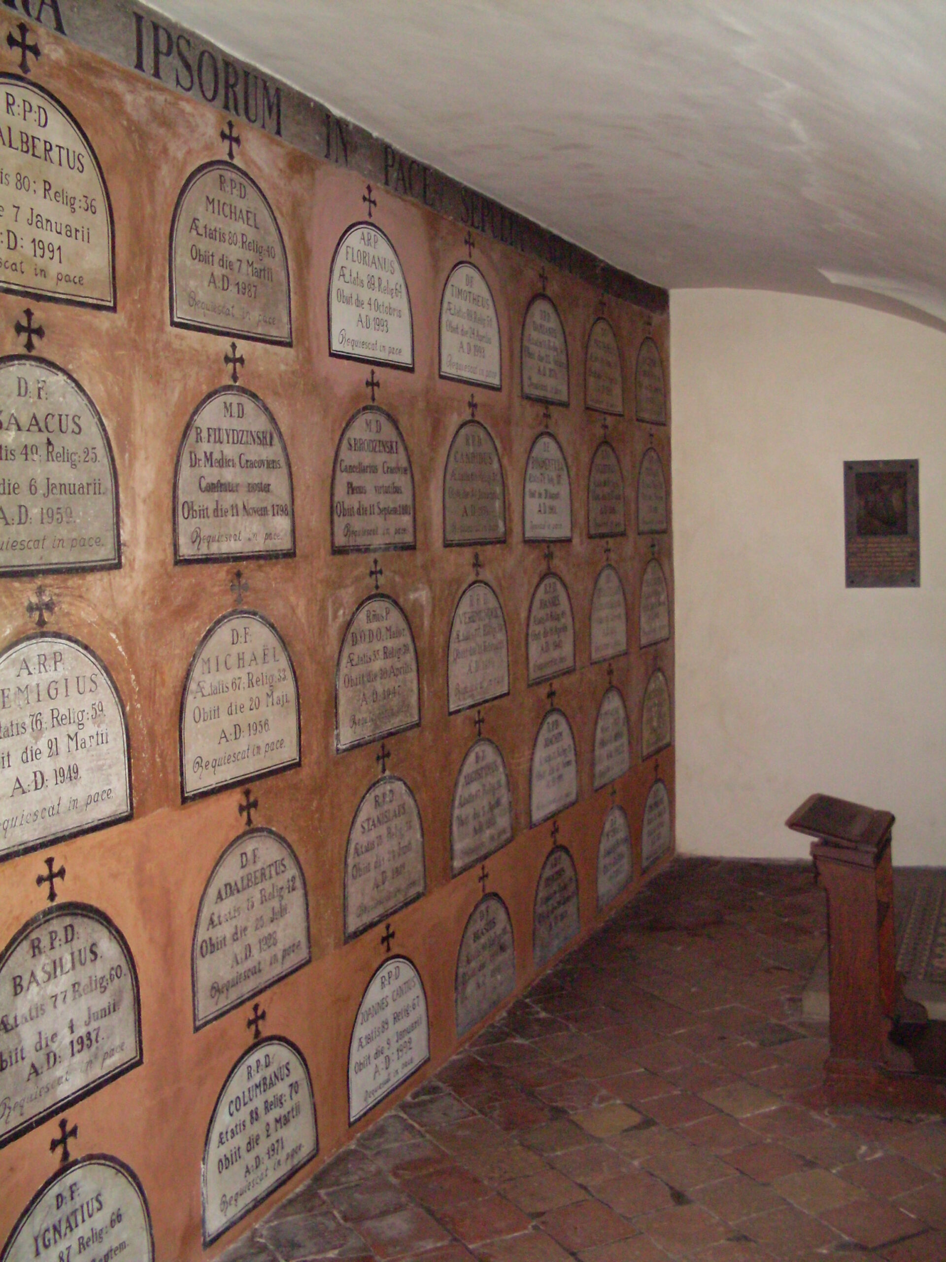 Pod prezbiterium znajduje się krypta-kaplica, w której w specjalnych niszach zamurowywano doczesne szczątki braci na sto lat. Napisy informują jedynie o imionach zmarłych, ich wieku oraz „stażu” w klasztorze. Kamedułów chowano nie w trumnach lecz na specjalnej desce, bez obuwia, jedynie w białym habicie zakonnym.