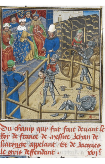 Ostatni pojedynek sądowy w Królestwie Francji, którego użyto jako środka dowodowego w sprawie o ciężkie przestępstwo, stoczyli Jean de Carrouges i Jacques le Gris 29 grudnia 1386 roku w Paryżu. Sprawa dotyczyła gwałtu na żonie de Carrouges, Marguerite, którego miał się dopuścić le Gris. Mąż Marguerite rzucił rękawicę i zażądał rozstrzygnięcia w formie sądu bożego, a oskarżony podniósł ją, przyjmując wyzwanie. Pojedynek odbył się za zgodą monarchy i Parlamentu Paryskiego; król Karol VI oglądał go z trybun wraz z liczną widownią.